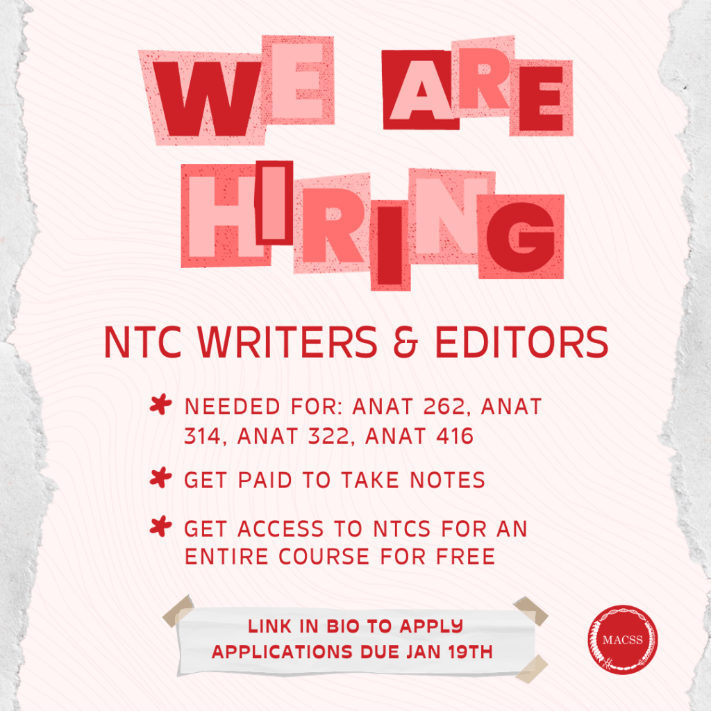 We are currently looking to hire NTC writers and editors for ANAT courses this semester!