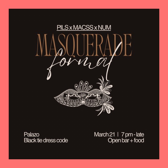We’re so excited to bring to you the 2024 PILS x MACSS x NUM Masquerade Formal! Join us on March 21st from 7pm-late at Palazo for a night of dancing, libations and glamour!